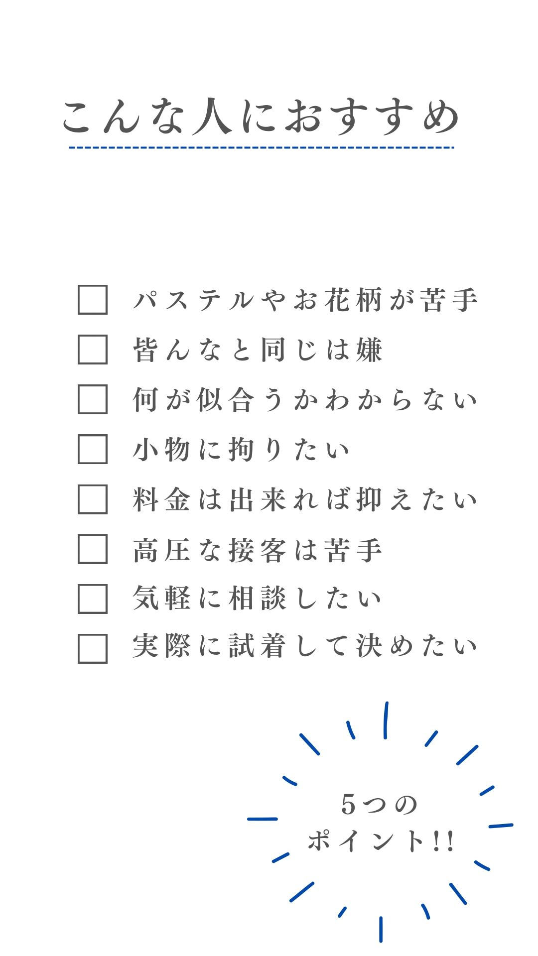 確かな知識と、今までの経験から「なるべく料金を抑えつつ、質やスタイリングには拘って自分らしい一着を見つけてほしい」そんな想いで運営しています。