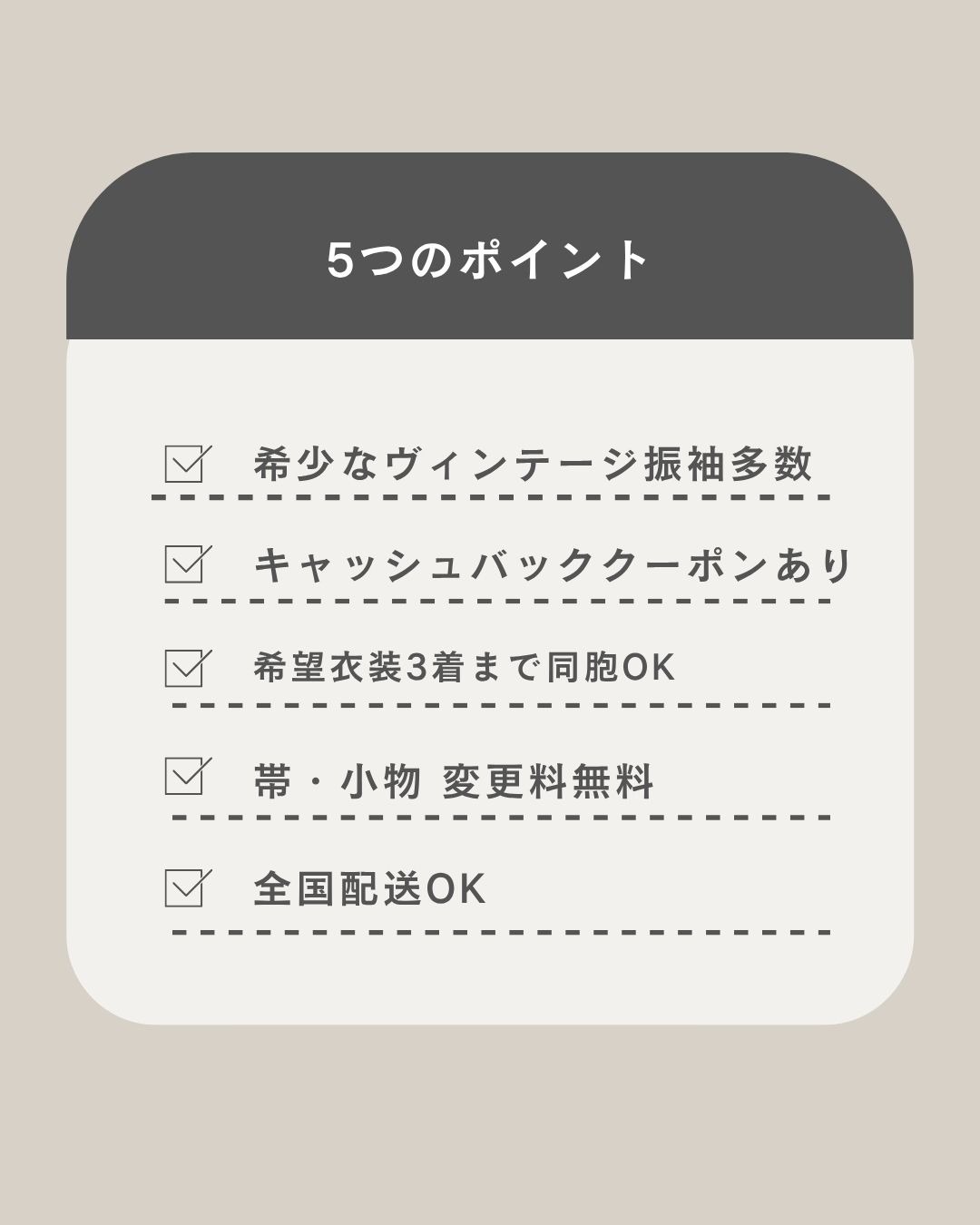 Tweny.(トゥエニードット)ではヴィンテージ振袖を中心に厳選したお着物を100着以上取り揃えており、全国に向けてレンタルを行っています。
