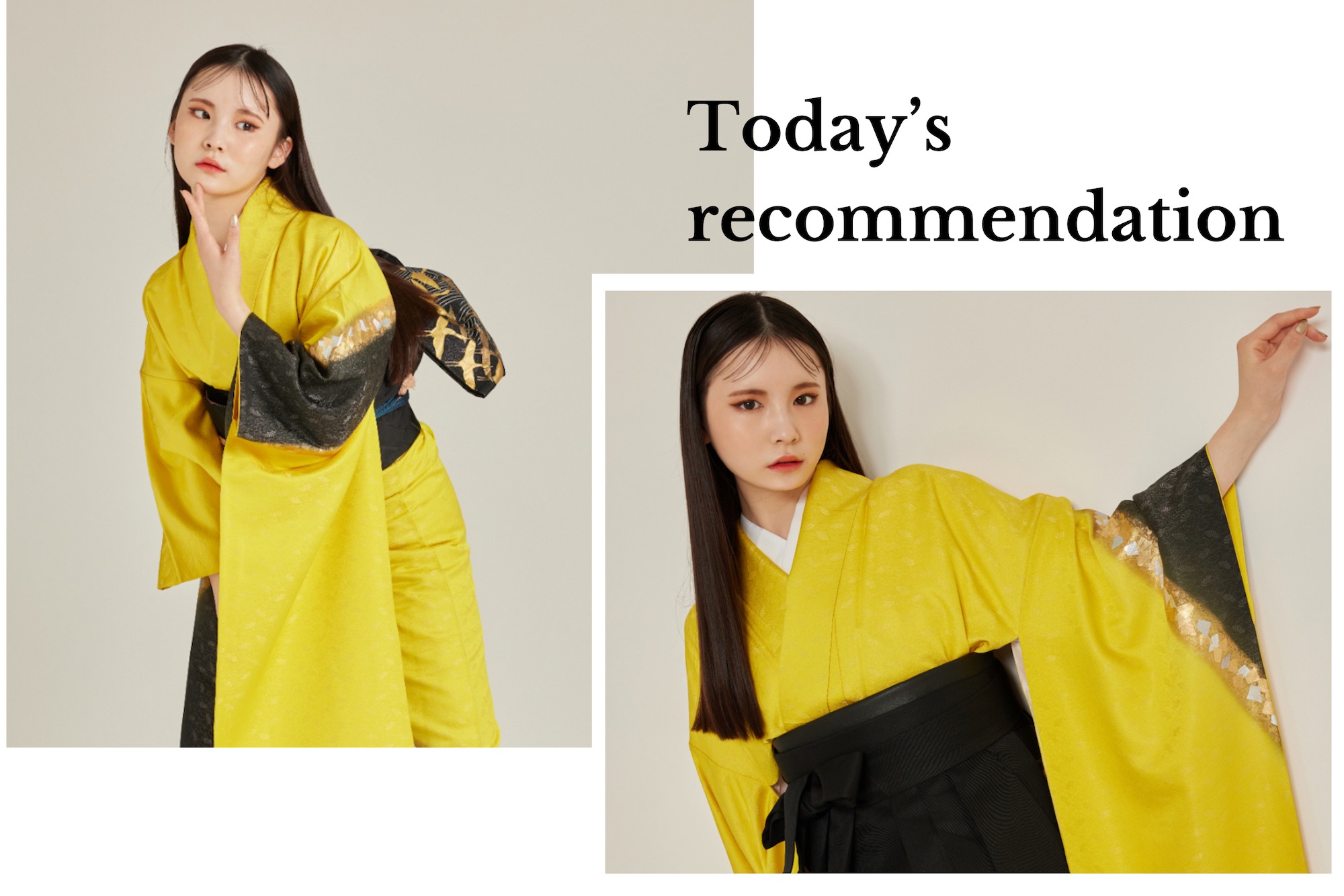 鮮やかなイエローに黒と金のコントラストが映える、華やかなヴィンテージ振袖をご紹介します。大きく描かれた金のモチーフが印象的で、存在感のあるデザインは成人式の振袖レンタルとしても、卒業式の袴レンタルとしてもおすすめです。